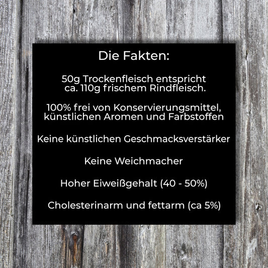 Hos oss kan du trygt kjøpe smakfulle snacks, for vi legger stor vekt på kvalitet og bruker førsteklasses, gressfôret storfekjøtt fra Østerrike til vårt Beef Jerky. Overbevis deg selv og opplev forskjellen.